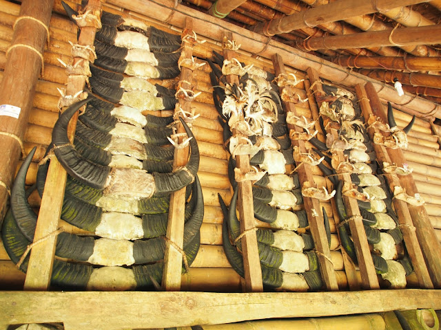 Z přední strany, kde jsou vchodové dveře, je vyvýšená veranda. Do domu se z ní vstupuje po schůdkách, nebo buvolích rozích, které zdobí celou tuto stěnu. Čím více rohů, tím váženější rodina. Pokud přijdete na návštěvu, musíte na verandu vejít zepředu. Není slušné na ni vylézt z boku. To si může dovolit jen člen rodiny nebo dobrý známý.