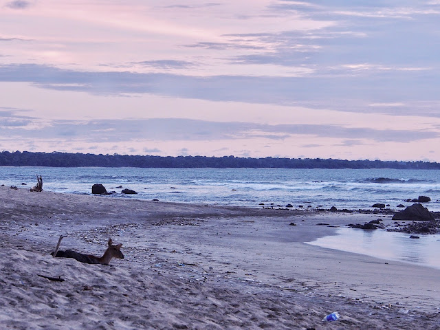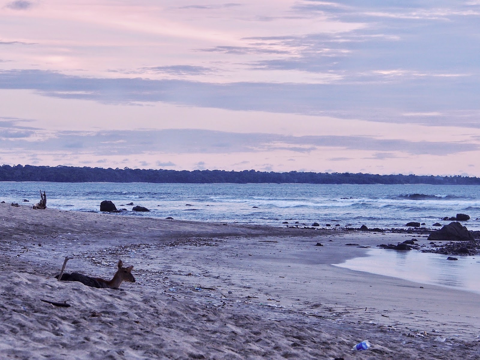 Na pláž vzdálenou 15 km od vrátnice jsme dorazili už skoro se západem slunce. Zmizeli od tam i poslední návštěvníci a my zůstali sami jen s opicemi a hlídači. Zeptali jsme se jednoho z nich, jestli můžeme v parku přespat, že jsme unavení a zítra se musíme vrátit na Bali, takže bychom už neměli čas se tu porozhlédnout. Ale řekl, že nemá na tohle oprávnění a je potřeba to vyřešit s jeho nadřízenou. Bohužel to byla žena, což v Indonésii znamená, že cokoli by šlo, prostě nejde. Ženy jsou ve funkcích přísnější a poctivější. Takže ta hned oznámila, že musíme vyjet ven. Ale to se nám v této fázi už opravdu nechtělo. Za naprosté tmy jsme se vraceli zpět k vrátnici, ale než jsme dorazili k druhé hlídce (na půl cesty), zaparkovali jsme na kraji cesty a posadili se do trávy. Přemýšleli jsme, co udělat pro to, abychom pryč nemuseli. Greg uviděl siluetu savanůvky (česko-polský výraz pro posed uprostřed savany) a napadlo ho, že můžeme přespat tam. Bála jsem se, protože jsme věděli, že žena z hlídky volala na vrátnici a tam nás budou čekat (řekla nám totiž, že už jsme při vjezdu věděli, jak to s přespáváním v parku je, a tak se nemůžeme divit).