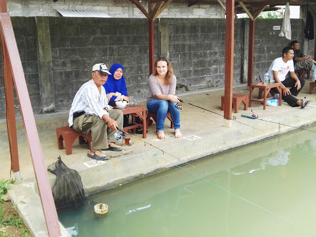 S mojí indonéskou rodinou jsme se jednu sobotu rozhodli strávit dopoledne právě chytáním ryb. Po hodině cesty autem jsme přijeli do malé vesnice a cestou kolem řeky jsme se dostali až na její konec. Idylické místo k rybaření! Ale byla jsem velice překvapená, když jsem zjistila, že naším cílem není ona řeka, ale vodní nádrž na zahradě jednoho z domů.